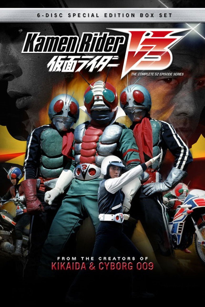 Follow the adventures of Shiro Kazami, a bio-chem major at Jonan University in Tokyo. After witnessing the murder of a member of the evil organization Destron, Kazami is targeted by Destron which kills his family and leads him down a road of revenge that crosses paths with both Hongo Takeshi and Ichimonji Hayato, the original Kamen Riders and his eventual transformation into Kamen Rider V3!